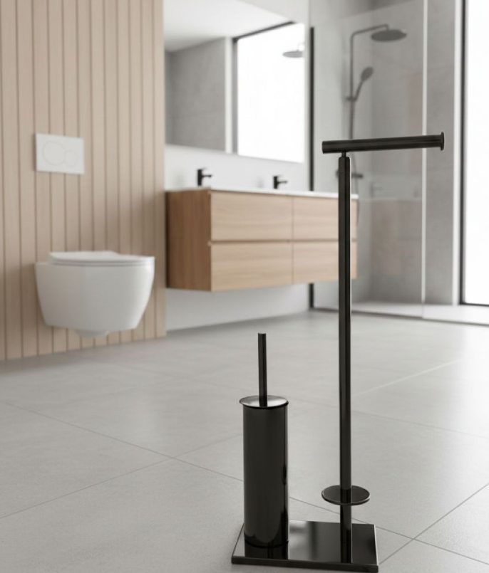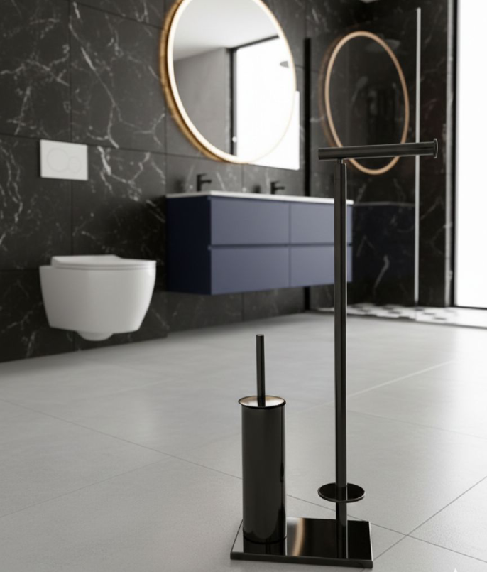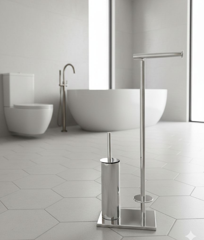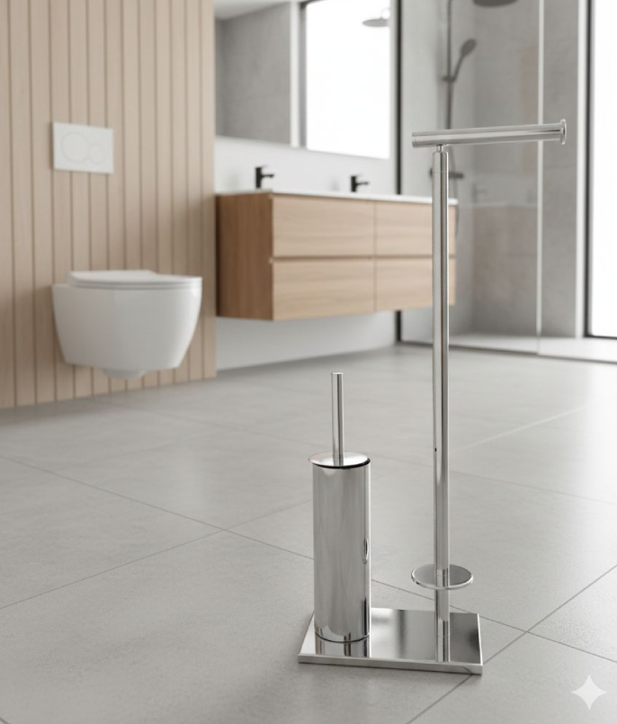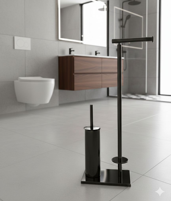 Elevate your bathroom space with this modern freestanding toilet paper holder and brush set. Designed with clean lines and a sleek minimalist aesthetic, it blends functionality with contemporary elegance. The sturdy, well-balanced base provides excellent stability, while the premium finish adds a refined, high-end touch A practical yet stylish accessory that complements modern and sophisticated bathroom interiors.