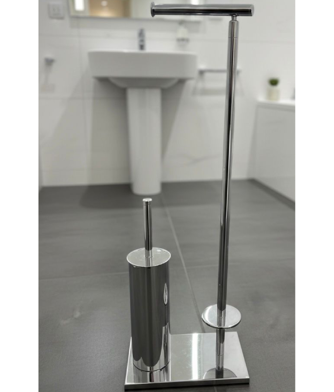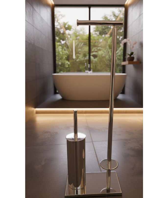 Add a touch of refined elegance to your bathroom with this freestanding toilet paper holder and brush set. Finished in sleek chrome, its clean lines and modern silhouette create a sophisticated look that complements contemporary interiors. The solid square base ensures excellent stability, while the premium finish enhances durability and shine