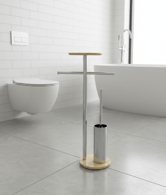 Modern freestanding toilet paper holder with integrated toilet brush designed to combine functionality with natural elegance.Featuring a sleek metal structure paired with warm wood accents