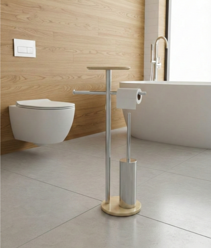 Elevate your bathroom space with this modern freestanding toilet paper holder and brush set. Designed with clean lines and a sleek minimalist aesthetic, it blends functionality with contemporary elegance. The sturdy, well-balanced base provides excellent stability, while the premium finish adds a refined, high-end touch A practical yet stylish accessory that complements modern and sophisticated bathroom interiors.