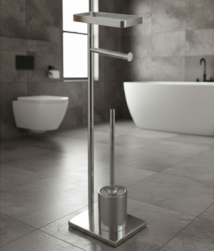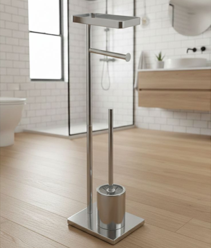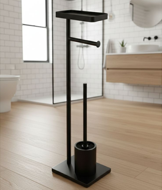 Elevate your bathroom space with this modern freestanding toilet paper holder and brush set. Designed with clean lines and a sleek minimalist aesthetic, it blends functionality with contemporary elegance. The sturdy, well-balanced base provides excellent stability, while the premium finish adds a refined, high-end touch A practical yet stylish accessory that complements modern and sophisticated bathroom interiors.